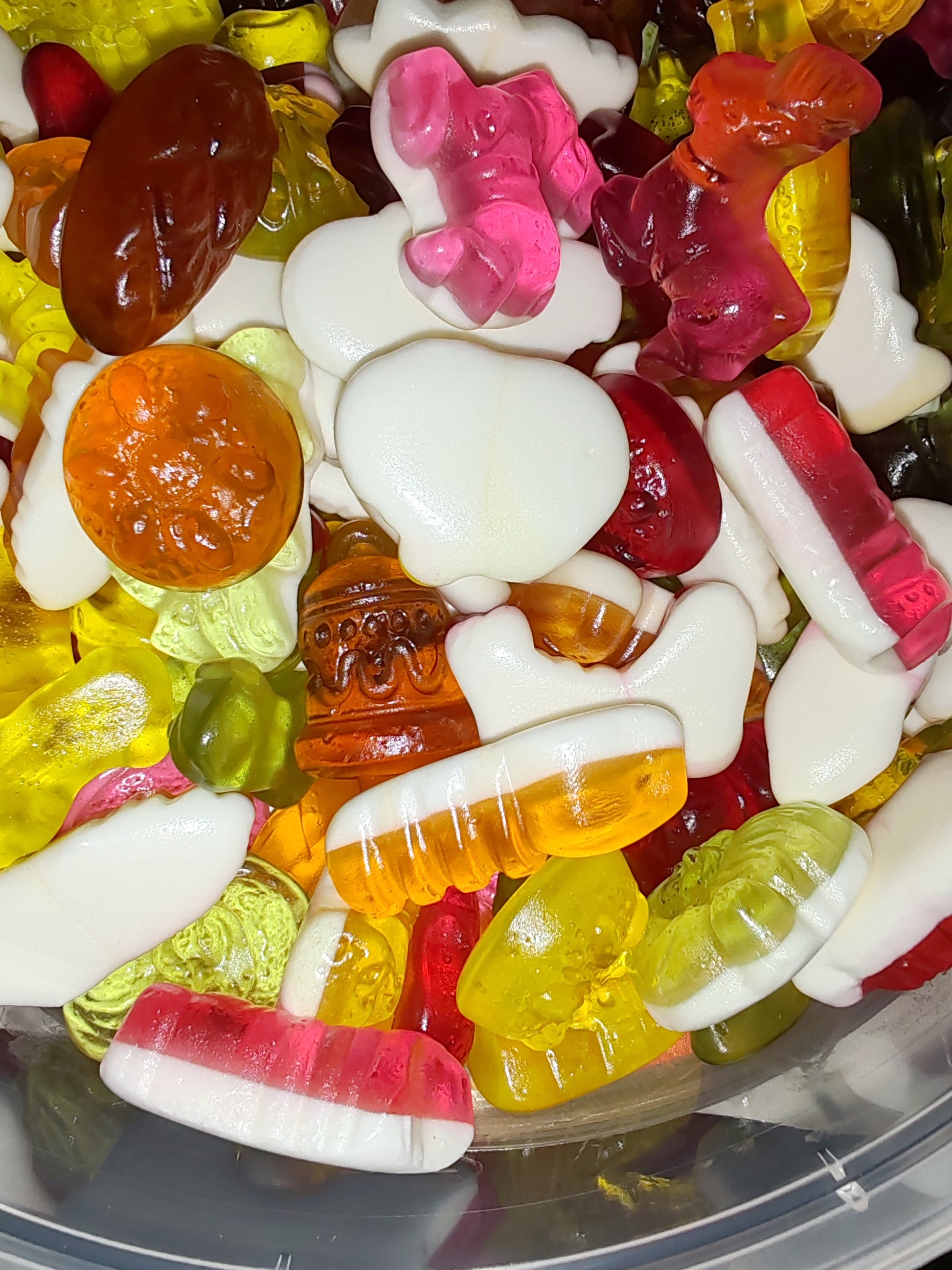 Ingrédients: sirop de glucose, sucre, gélatine, acidifiant : acide citrique, concentré de jus de pomme, colorants alimentaires : cassis, carotte, sureau, raisin, citron, carthame, arôme, glaçage : cire d'abeille blanche et jaune, cire de carnauba.